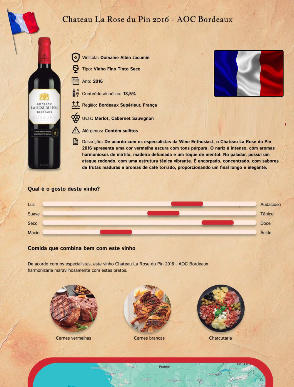 De acordo com os especialistas da Wine Enthusiast, o Chateau La Rose du Pin 2016 apresenta uma cor vermelha escura com tons púrpura. O nariz é intenso, com aromas harmoniosos de mirtilo, madeira defumada e um toque de mentol. No paladar, possui um ataque redondo, com uma estrutura tânica vibrante. É encorpado, concentrado, com sabores de frutas maduras e aromas de café torrado, proporcionando um final longo e elegante.
